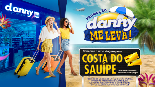 Além das ofertas incríveis, um prêmio imperdível! A “Danny Me Leva!” pode te levar para um paraíso com tudo pago! A cada R$ 80,00 em compras nas lojas físicas, você ganha 1 cupom para concorrer a uma viagem completa para Costa do Sauípe com acompanhante.